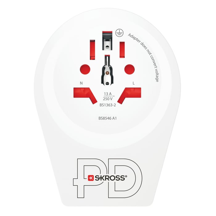 Jordet reiseadapter for å koble til utstyr fra bl.a. USA, England, Japan, Italia og Australia i Norge. Brukes til å koble til utstyr med støpsel av typen A, B, G, I, J, L og N i en stikkontakt av typen F. Maksbelastning: 4000 W. Krever jordet uttak.