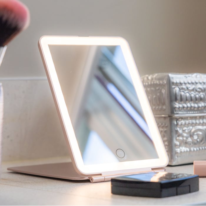 Et sminkespeil i kompakt format som passer like godt hjemme som på hotellrommet eller på hytta. Speilet lyser sterkt og jevnt slik at du ser hver detalj. Lokket fungerer som stativ, og du bytter enkelt mellom de tre lysinnstillingene varm, naturlig og kald med touch-knappen. Speilet har opptil én times driftstid og lades via den medfølgende USB-C-kabelen.