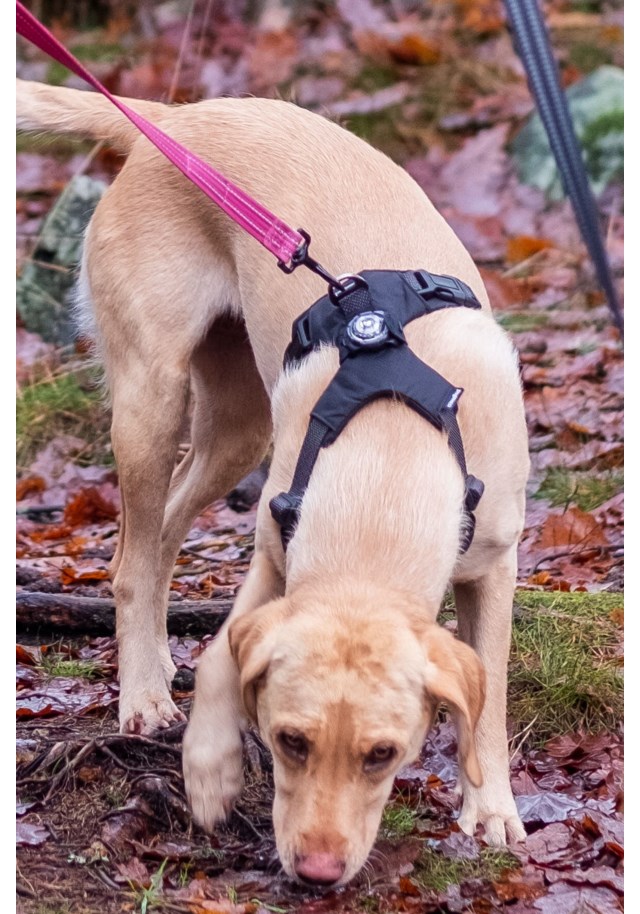 Polstret sele med flere ulike innstillinger. Justerbar rundt halsen, brystet og under. Fleksibiliteten gir fri bevegelse for hunden. Mål: hals: 17-58cm bryst: 65-80cm
