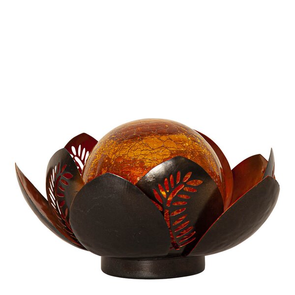 Lilly solcelleddekorasjon fra Star Trading er et vakkert blikkfang i hagen eller på balkongen. Den ravfargede glasskulen omgis av kobberfargede metallblader, som gir dekorasjonen et elegant og varmt uttrykk. Når mørket faller på, skinner lyset gjennom kulen med en gyllen glød som skaper en lun og innbydende atmosfære. Dekorasjonen er solcelledrevet og lades opp via det integrerte panelet i løpet av dagen. Når solen går ned, aktiveres lyset automatisk ved hjelp av det medfølgende batteriet. Med en høyde på 12 cm og en bredde på 24 cm passer den perfekt på utebordet, i blomsterbedet eller på en hylle i uterommet. Lilly er en dekorativ og stemningsfull detalj som løfter helhetsinntrykket i ethvert utendørs miljø.