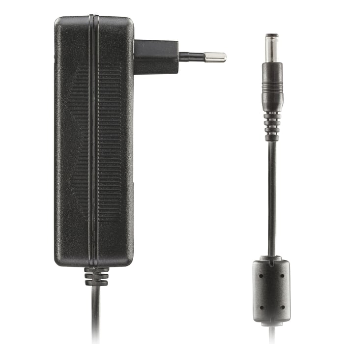 Svitsjet strømadapter med fast utgangsspenning på 12 V (DC) som leverer opptil 3 A. Leveres med tilkoblingskabel med fast DC-plugg (5,5 x 2,1 mm). Kabellengde: 1,5 m. Inngangsspenning: 100–240 V (AC).