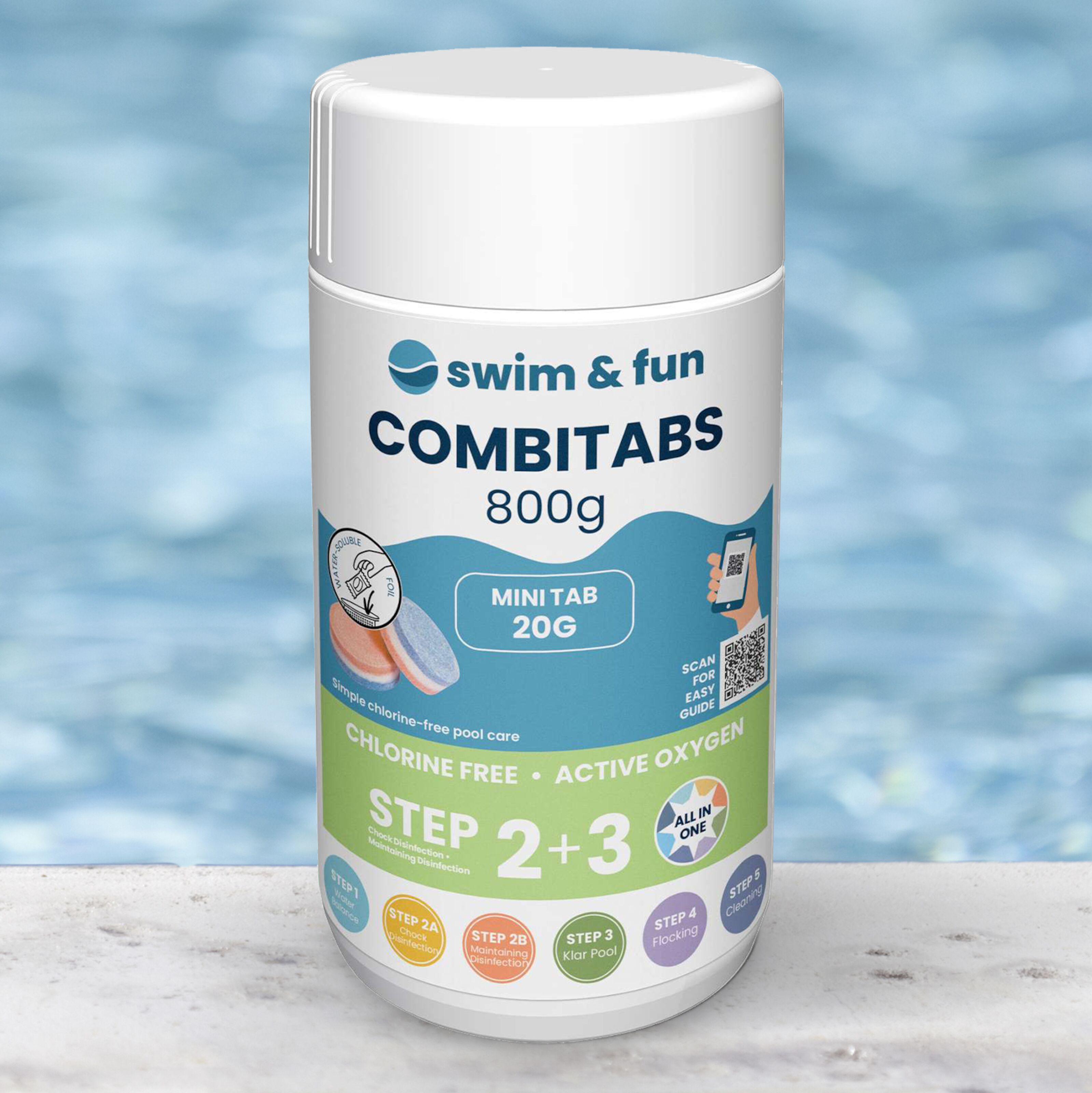Tredelt tablett for basseng uten klor. Delene inneholder rask desinfeksjon med aktivt oksygen, for-sterking og forlenging av desinfeksjonen og middel som motvirker utvikling av kalk og mineraler i vannet. Tilsett 1 tablett per 1000 liter vann hver tredje dag for å opprettholde desinfeksjonen. Leve-res i en plastbeholder med barnesikret lokk. Beholderen er merket med detaljerte instruksjoner.