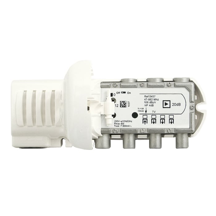 Kombinert strømforsyning for mastforsterker og signalforsterker for større antennesystemer. Perfekt for Televés Dat-HD (30618 og 30619) og der det er behov for mange uttak.