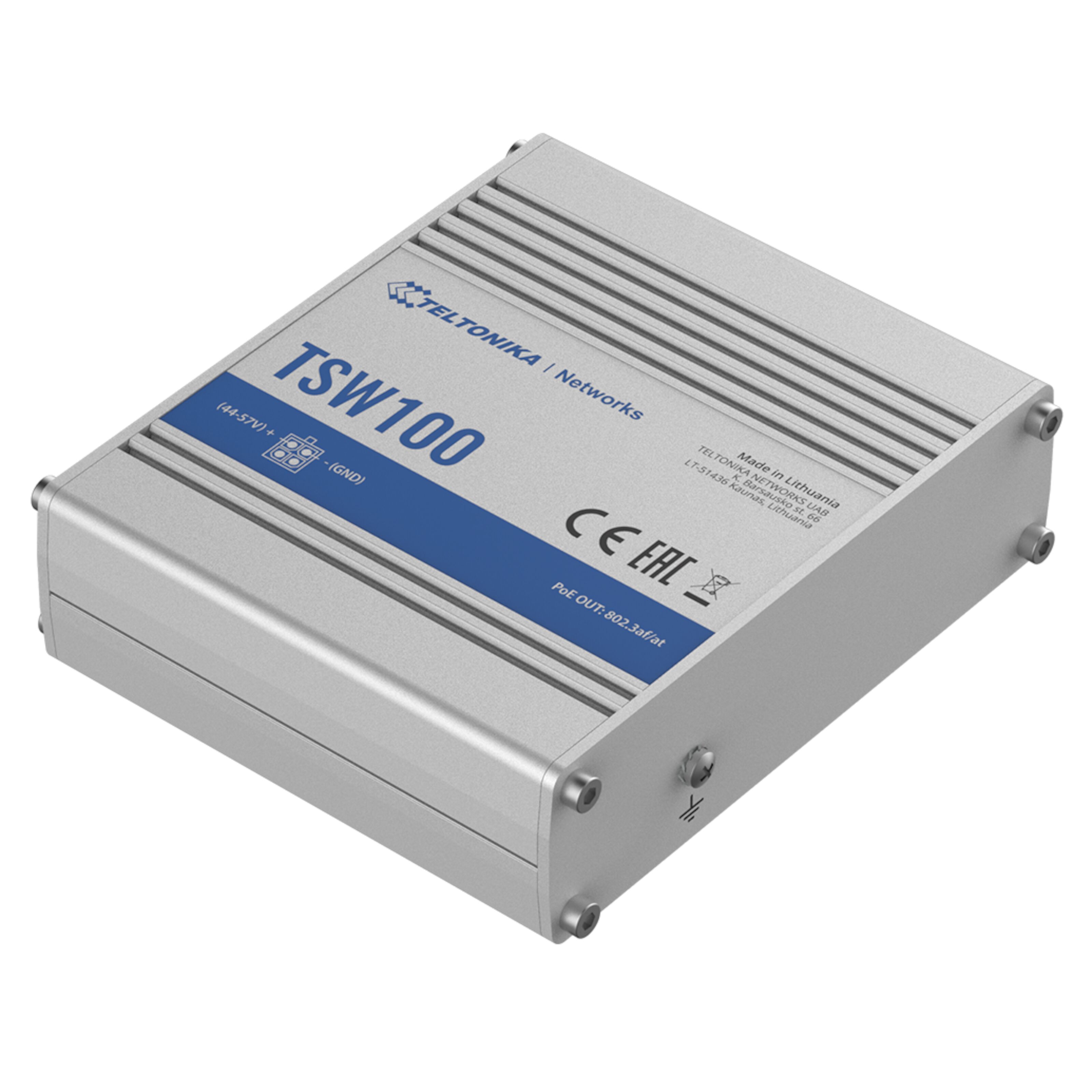 Teltonika TSW100 er en nettverksswitch i industriklasse med 4 PoE-porter (1 Gb/s). Kan totalt gi ut opptil 120 W (30 W per port). Fleksibel drift – kan mates med 7–57 V (PoE krever 44 V eller høyere). Krever ikke installasjon. Støtte for PoE 802.3af og 802.3at.