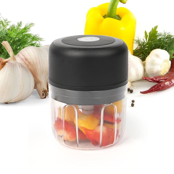 Kompakt, ladbar minihakker for grønnsaker og frukt. Hakker opp hvitløk, løk, paprika, chili m.m. raskt og jevnt. Trådløs – frihet på kjøkkenet, utendørs ved grillen og på camping. Enkel å ta i bruk, skylle og å holde ren. Lades via USB-C med mobillader (selges separat). OBS: ikke for bruk med is eller andre harde råvarer.