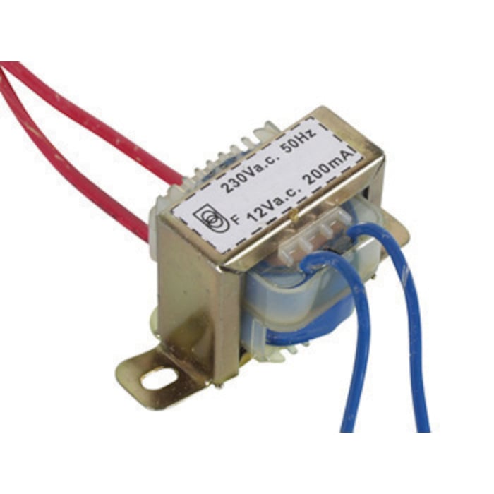 Fulltransformator for kabinettmontering. Røde kabler på primærsiden og blå kabler på sekundærsiden.
