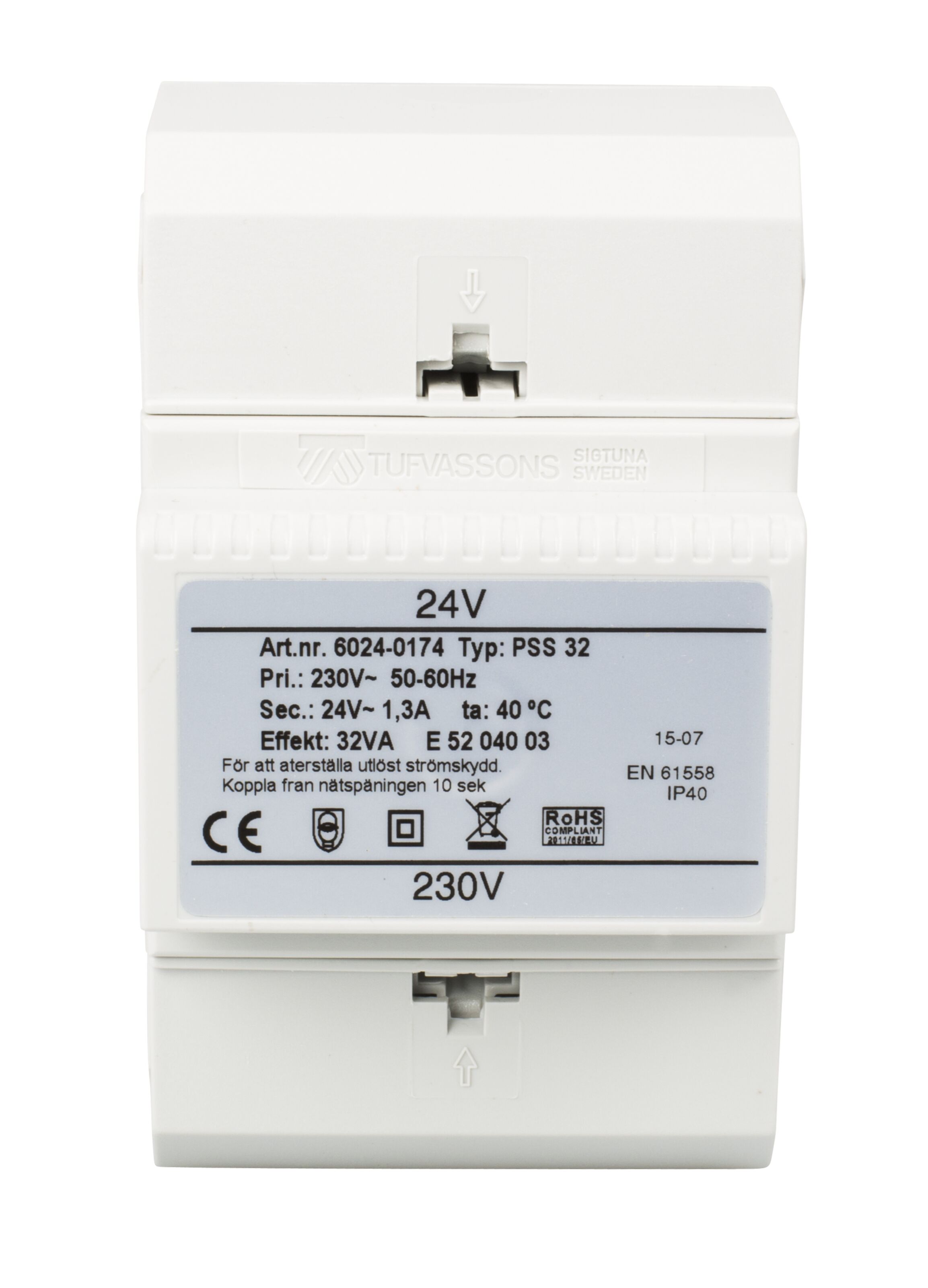 AC-installasjonstransformator med fast utgangsspenning. Høy motstand mot kortvarig overbelastning. Maks belastning avhenger av spenning. Leverer opptil 2600 mA (ved 12 V), 1900 mA (ved 17 V) og 1300 mA (ved 24 V). Den passer utmerket som strømforsyning av signaleringsanordninger, overvåkingssystemer og adgangskontrollsystemer. Monteres på DIN-skinne eller skrus fast til veggen. Transformatoren er beskyttet mot kortslutning og overbelastning. Tilkobling: skruterminaler. Vekt: 0,8 kg. Klassifisering: IP40. Modell: PSS32.