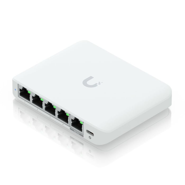 Viftefri 2,5 GB/s-switch med 5 nettverksporter. Kan drives via det inkluderte USB-C adapteret eller gjennom POE (PoE/PoE+: 44 - 57V DC). Gjennomstrømming: 12,5 Gb/s. Konfigureres gjennom UniFis konstnadsfrie kontroll-prgramvare (Windows, macOS) og kan enkelt integreres i større systemer som UniFi Dream Machine Pro. Leveres med USB-C strømadapter (5 V, 1 A). Mål: 117,1x90x21,2 mm.