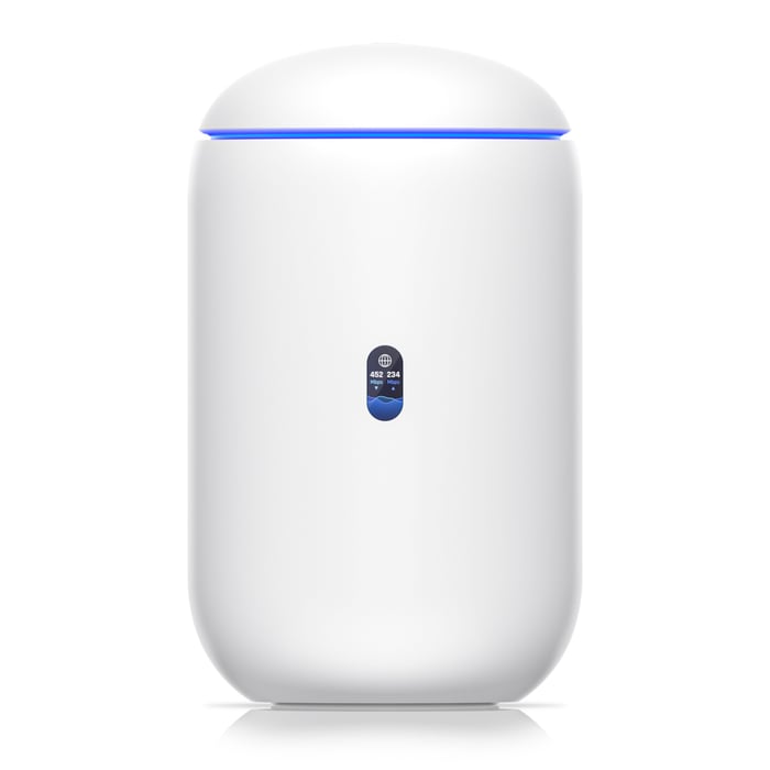 Unifi Dream Router er en komplett alt-i-ett-ruter som fungerer som en hub for ditt UniFi-nettverk med aksesspunkter og nettverkskameraer. Wifi 6 med opptil 3 Gb/s fordelt på 2,4- og 5-GHz-båndet med avansert 4x4 MU-MIMO- og OFDMA-teknologi, som gir et sterkt signal til enhetene dine. Utstyrt med 4-porters switch der 2 av portene har POE-støtte for å drive aksesspunkter og nettverkskameraer bare via nettverkskabelen. En fargeskjerm på fremsiden av enheten viser relevant informasjon, som hastigheter i nettverket, oppdateringer og statusmeldinger. Enkel installasjon via Unifi-webklient eller mobilapp (iOS/Android).