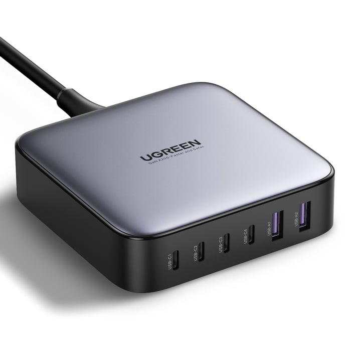Kraftig, kompakt multilader for alle enhetene dine – perfekt for skrivebordet og arbeidsstasjonen. Utstyrt med 4x USB-C-porter og 2x USB-A-porter. Støtte for opptil 200 W uteffekt ved bruk av alle porter. Da kan du lade datamaskinen, nettbrettet og mobilen samtidig. Kobles til via medfølgende, avtakbare C5-kabel (2 m). Leveres også med USB-C-kabel (1 m) med støtte for opptil 100 W.