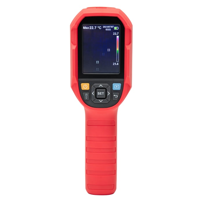 Varmekamera for enkelt å finne varmelekkasjer, kuldetrekk, inspisere el-skap, feilsøking og reparasjon. Utstyrt med en 2,8" skjerm med live-visning og infrarød oppløsning på 120x90 målepunkter. Fotograferingsfunksjon og minnekortspor for lagring av bilder (16 GB Micro-SD-kort følger med). Autoavlesning av høy/lav temperatur, innebygd lommelykt, stativfeste og IP65-klassifisering.