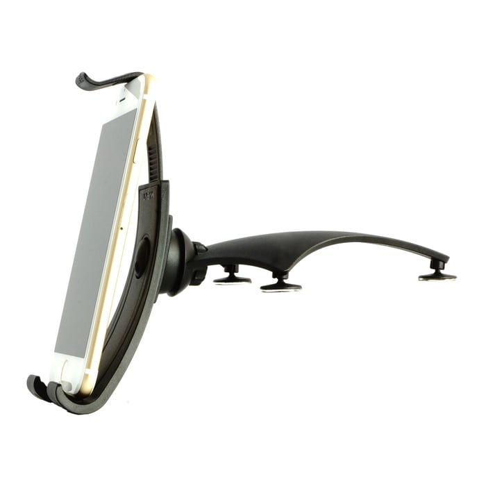 Mobil- og GPS-holder for bilen. Festes på dashbordet med tre sterke selvklebende føtter (etterlater ikke klebrige rester). Kan vippes og roteres 360° ved hjelp av det låsbare kuleleddet. Passer til enheter fra 104 til 168 mm.