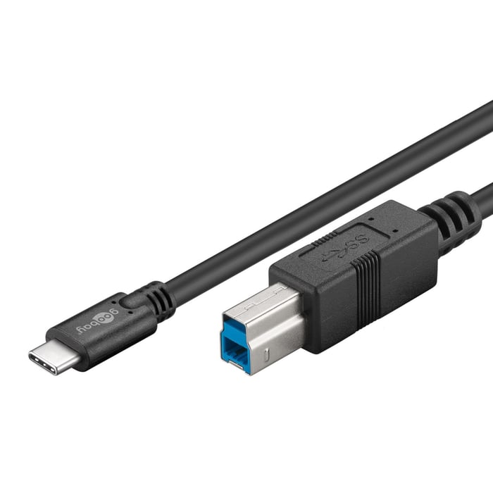 Kabel med USB-C til USB-B 3.0-kontakt. Støtte for overføringshastigheter på opptil 5 Gb/s (USB 3.2 Gen 1). Støtte for lading og strømtilførsel på opptil 15 W. Kabellengde: 1 m.