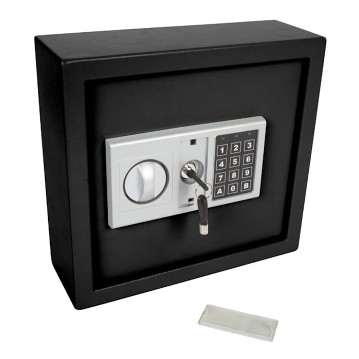 Sikkerhetsskap i metall for nøkler. Kodelås med kode på 3 til 8 sifre. Kan også åpnes med nøkkel hvis koden glemmes eller batteriene tar slutt. Inkluderer nøkkelringer og nøkkelbrikker i ulike farger. Justerbare nøkkelkroker som holder opptil 30 nøkkelringer. Leveres med bolter for montering på vegg. Drives av 4x AA-batterier (følger ikke med). Ytre mål: 280x300x100 mm. Vekt: 4,5 kg