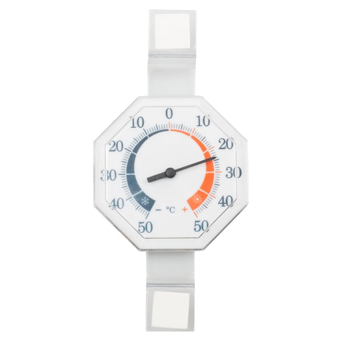 Selvklebende, analogt utendørstermometer for montering utenfor vinduet. Måleområde: -50 til 50 °C.