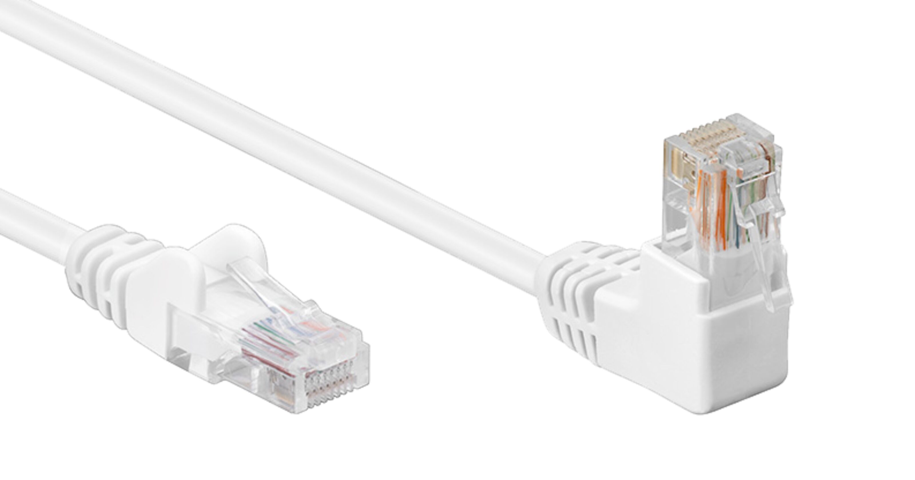 Nettverkskabel med helstøpte RJ45-kontakter, hvorav én er vinklet for installasjon på trange steder. Egnet for overføring i 100 Mb/s. Uskjermet Cat. 5e. Båndbredde: 100 MHz.