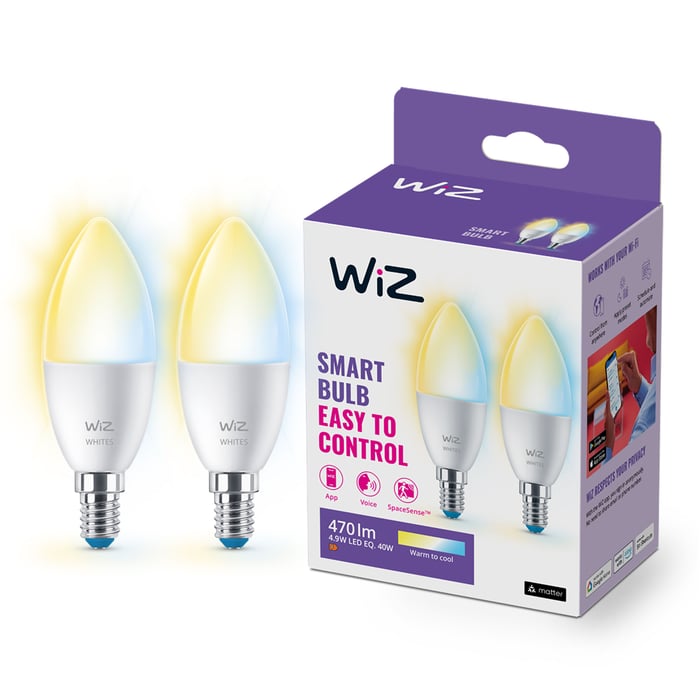 Smart LED-pære for WiZ Connected-systemet. Kobles via wifi til WiZ-appen, slik at du kan justere fargetemperatur (kaldt/varmt) og lysstyrke eller bruke forhåndsinnstilte lysinnstillinger. Kan også styres når du ikke er hjemme. Innebygd bevegelsessensor for automatisk av/på-funksjon (krever minst 2 lyspærer i et rom). Innebygd oversikt over energiforbruk som lagres direkte i appen. Sokkel: E14. Lysfluks: 470 lm. Fargetemperatur: 2700-6500 K. 2-pk.