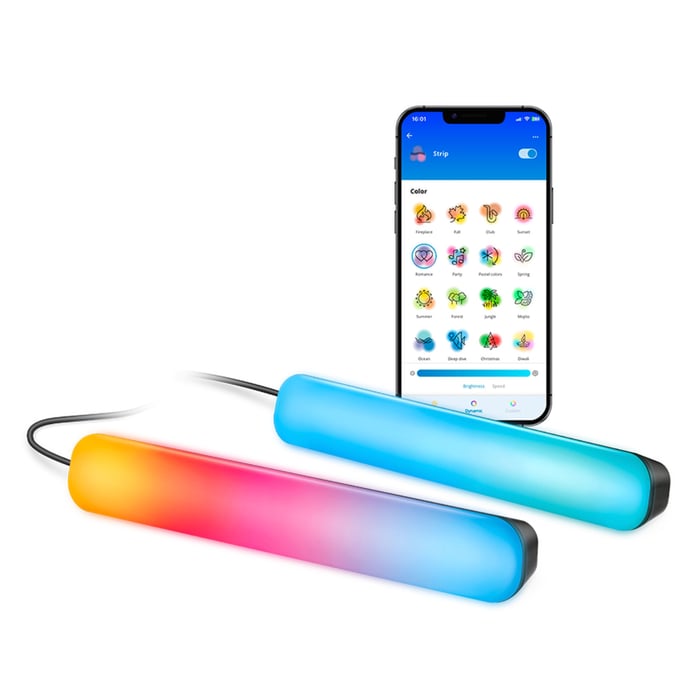WiZ Gradient Light Bars RGBIC er en topakning med smarte lysstaver som gir stemningsfull belysning med avansert RGBIC-teknologi. Hver lysstav kan vise flere farger samtidig, noe som skaper levende og dynamiske lyseffekter – velegnet for gaminghjørnet, filmkvelden og stua. De kan styres via WiZ-appen eller med tale, og fungerer med populære smarte assistenter. Takket være den kompakte designen og medfølgende monteringsløsninger er de enkle å plassere der du vil ha dem.