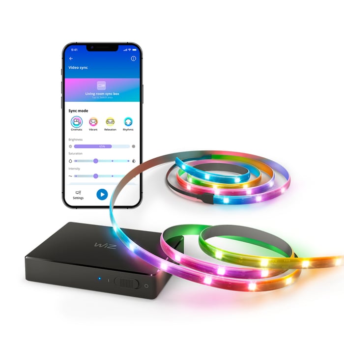 WiZ SynkBox Startkit for TV-apparater mellom 75" og 85" skaper en oppslukende lysopplevelse ved å synkronisere bakgrunnsbelysningen med innholdet på skjermen. Med HDMI 2.0 og wifi kobler du enkelt til ulike enheter. RGBIC-teknologien byr på dynamiske fargeoverganger, mens den justerbare fargetemperaturen (2700–6500 K) gir en kinolignende atmosfære. Styr belysningen via WiZ-appen, og tilpass lysstyrken og fargene etter humøret. Enkel installasjon uten eksternt kamera.