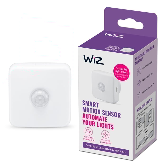 Styr belysningen din ved hjelp av bevegelsesdeteksjon. Den trådløse og batteridrevne innendørssensoren er enkel å plassere og er alt du trenger for effektivt å styre belysningen din. Kompatibel med alle WiZ Connected-produkter. La sensoren tenne lysene i rommet du går inn i, eller senke belysningen når du forlater det. Du kan også justere lysinnstillingene basert på tid på dagen – perfekt for å få et behageligere lys sent om kvelden eller sterkere lys på dagtid. Batteri: 1x AA-batteri (følger med).